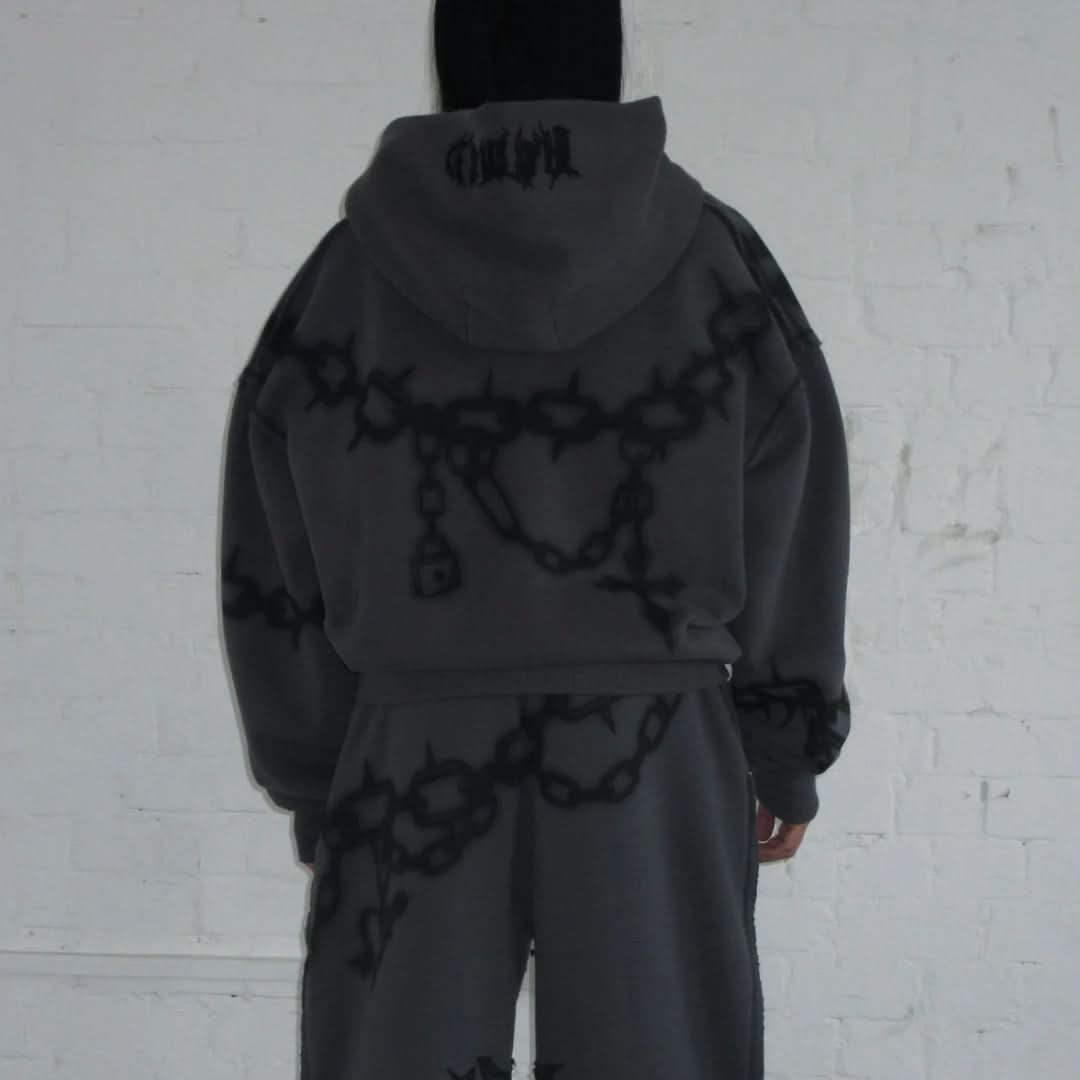 The Chains Zip Rhinestone Hoodie in Cast Iron combines premium craftsmanship with modern urban edge. Made from high-quality, sustainable fabric, it features a bold rhinestone chain design that adds a statement shimmer without compromising comfort. The sleek zip-up silhouette and relaxed fit make it perfect for everyday wear, concerts, or nightlife, offering a balance of street style confidence and luxury appeal that feels effortlessly unisex.