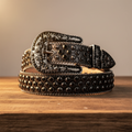 Our classic black strap with elegant black studded rhinestones and refined engraved buckle features prong-set stones (never glued) that maintain their understated glamour from office meetings to evening events. The Rhinestone Belts (TRB) combines timeless sophistication with premium construction – engraving that won't wear off, black finish that stays sleek.