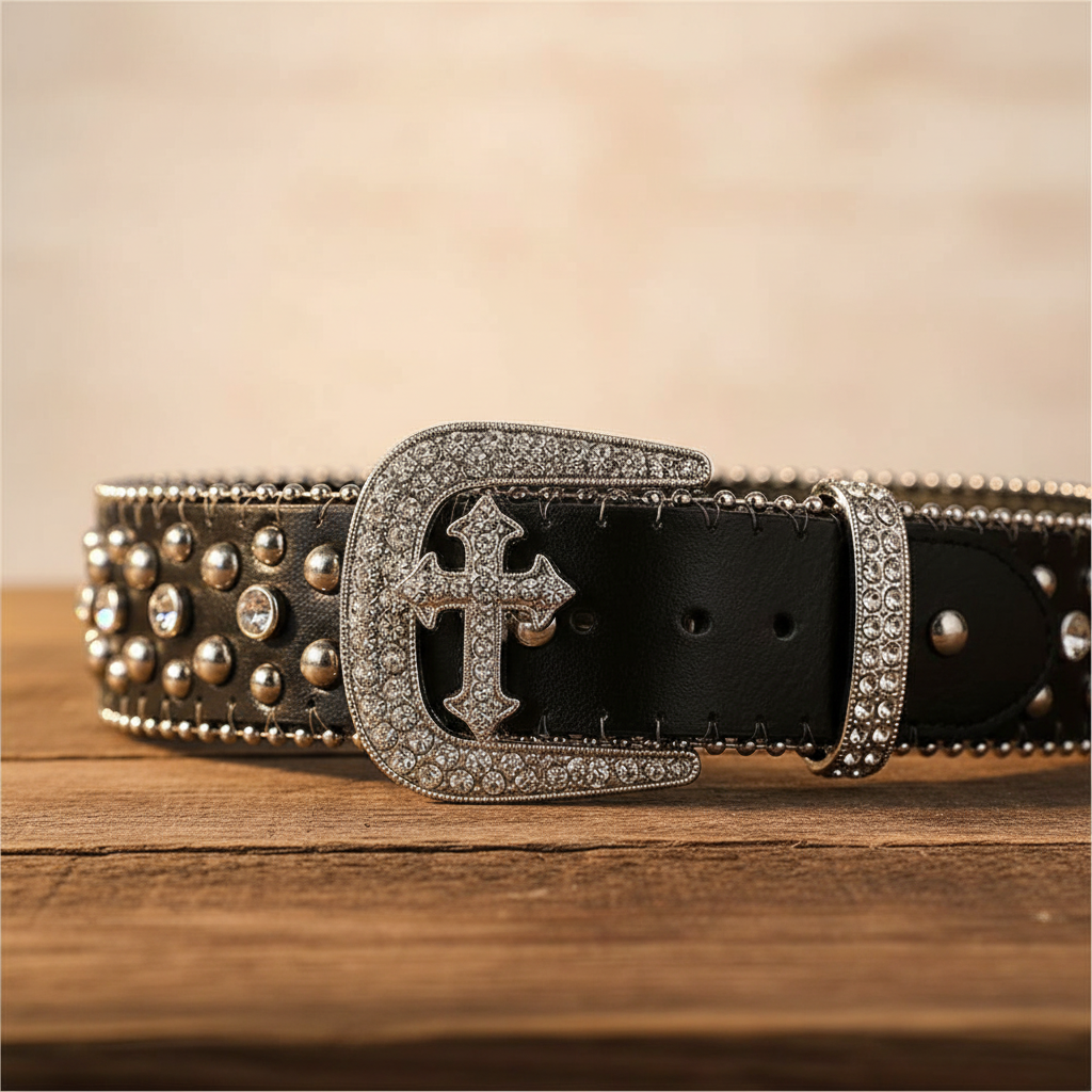 Our statement cross symbol features prong-set rhinestones (never glued) that stay put through line dancing, concerts, and everything in between. The Rhinestone Belts (TRB) combines rugged Western character with luxury-grade construction – a premium buckle that won't tarnish, reinforced strap that won't crack, genuine stones that catch every light.